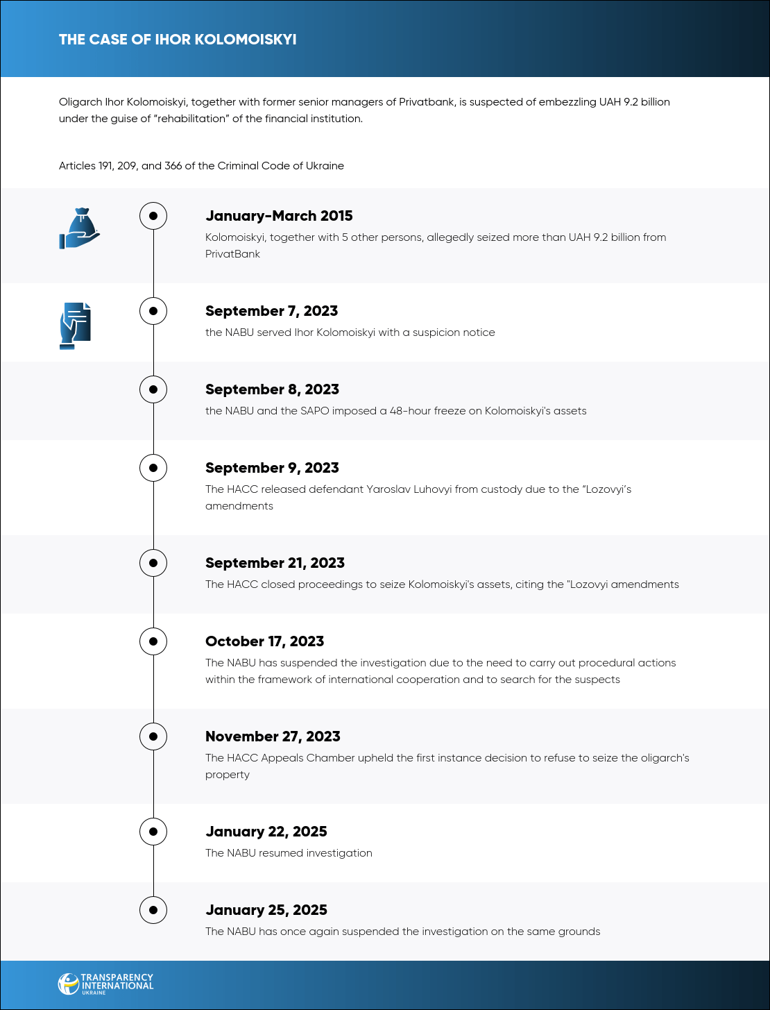 From March 2, 2014 to March 24, 2015, Kolomoiskyi served as the Head of the Dnipro Regional State Administration. This means that at the time of the incriminated actions, he was a Category A civil servant, which places the case under the jurisdiction of the NABU.