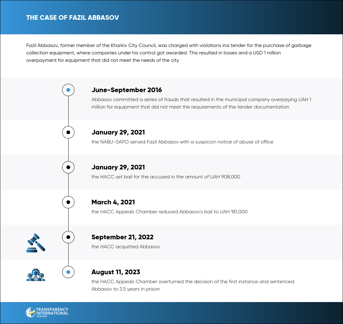 The court qualified his actions under Article 364, part 2 of the Criminal Code of Ukraine. The HACC acquitted Abbasov, but the SAPO prosecutor filed an appeal. The HACC Appeals Chamber overturned the acquittal, found the former official guilty, and sentenced him to 3.5 years in prison. Abbasov was taken into custody right in the courtroom.