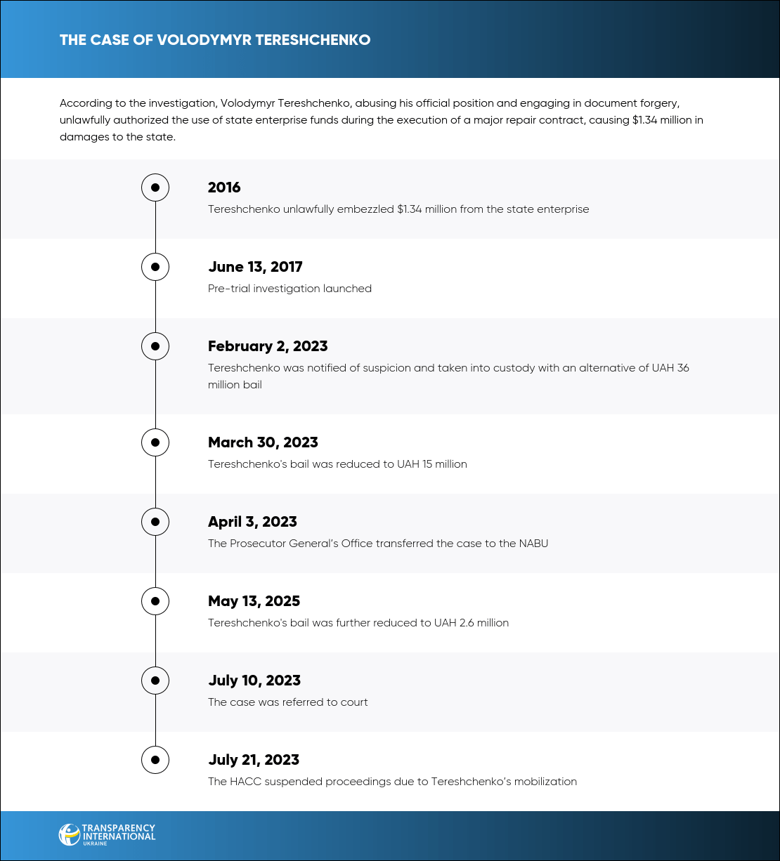 Tereshchenko is charged under Article 191(5) and Article 366(1) of the Criminal Code of Ukraine. Court proceedings are currently suspended due to his mobilization.