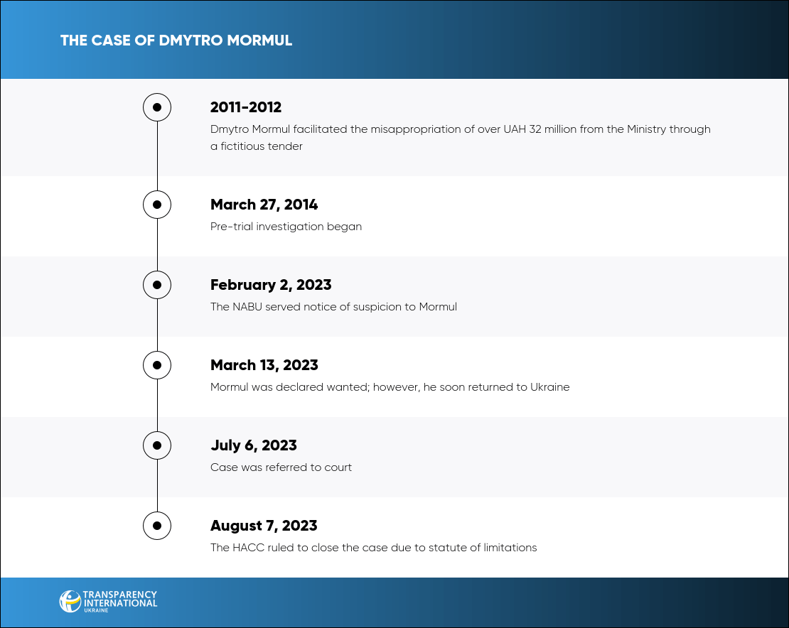 In addition, the prosecution claimed that Dmytro Mormul, acting in collusion with other officials of the Ministry, implemented a joint criminal intent aimed at securing a bribe for a third party. According to the investigation, budget funds were transferred to the accounts of fictitious offshore companies based on documents for supposedly developed and delivered software, which was in fact neither created nor handed over to the Ministry.