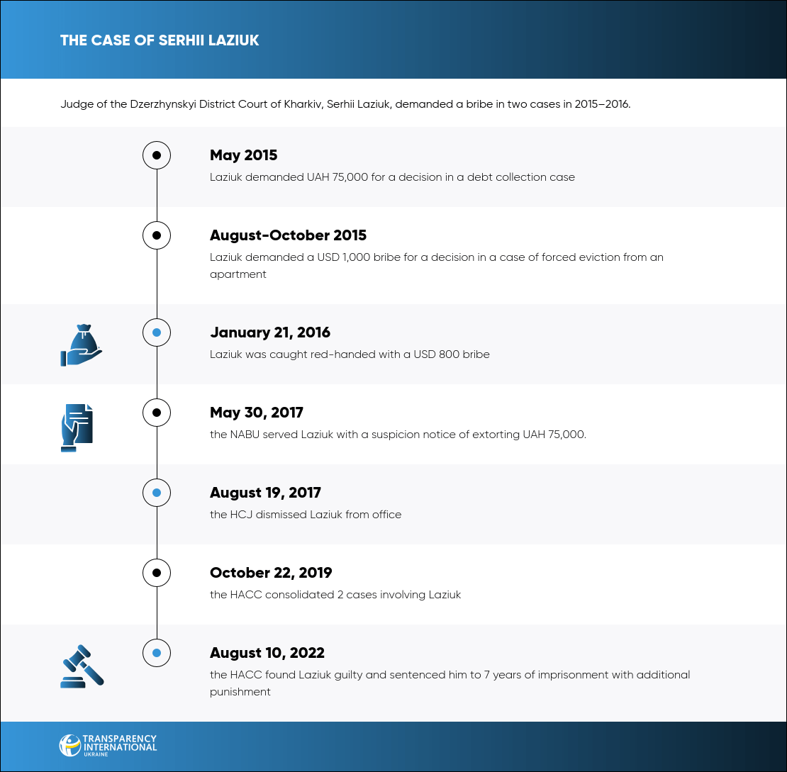 On August 10, 2022, the HACC found Judge Serhii Laziuk of the Dzerzhynskyi District Court of Kharkiv guilty of extorting bribes for rulings in civil cases. He was imprisoned for 7 years.