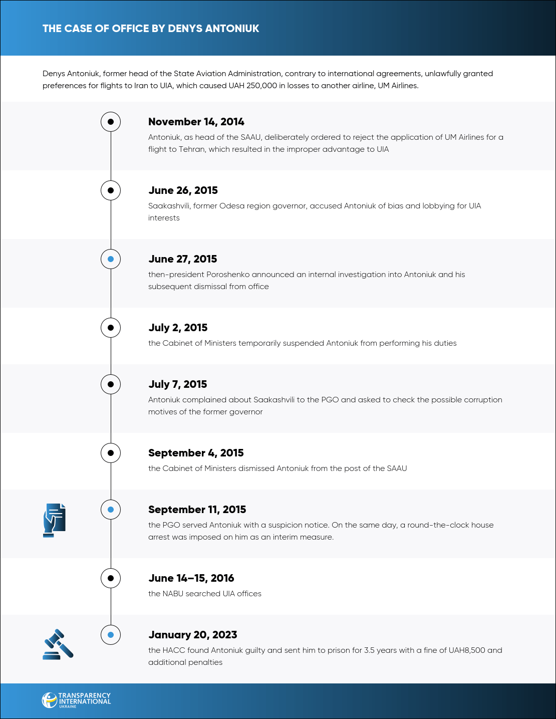 On January 20, 2023, the HACC found Denys Antoniuk, former head of the State Aviation Administration of Ukraine, guilty of providing Ukraine International Airlines with impoper advantage for more flights for self-serving motives. He was imprisoned for 3.5 years with additional penalties.