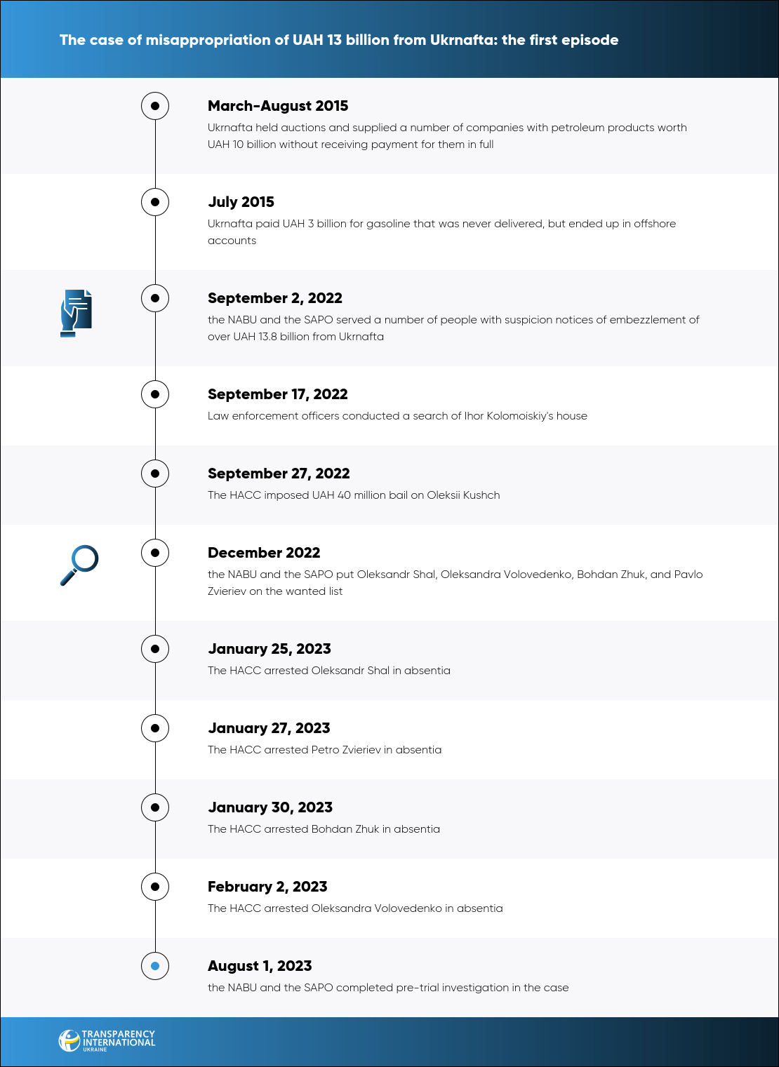 According to the law, Ukrnafta could not supply the products without a full prepayment in advance. However, according to the NABU, the oil products were still delivered in advance, processed at the Kremenchuk Refinery, and subsequently sold.