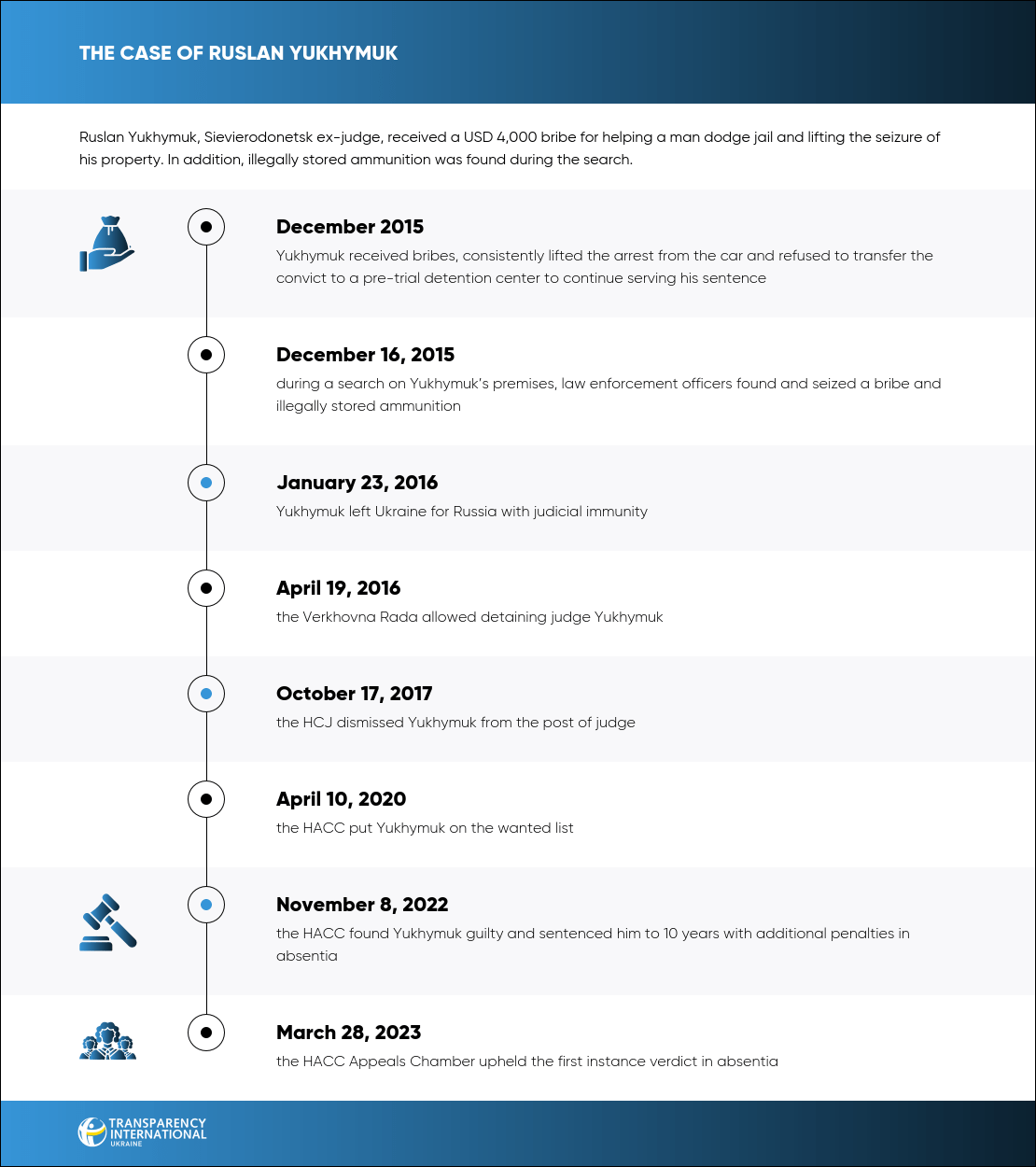 On November 8, 2022, the HACC found Ruslan Yukhymuk, a former judge of the Sievierodonetsk City Court, guilty in absentia of forgery, receiving a USD 4,000 bribe for “dodging jail,” and illegal possession of ammunition.