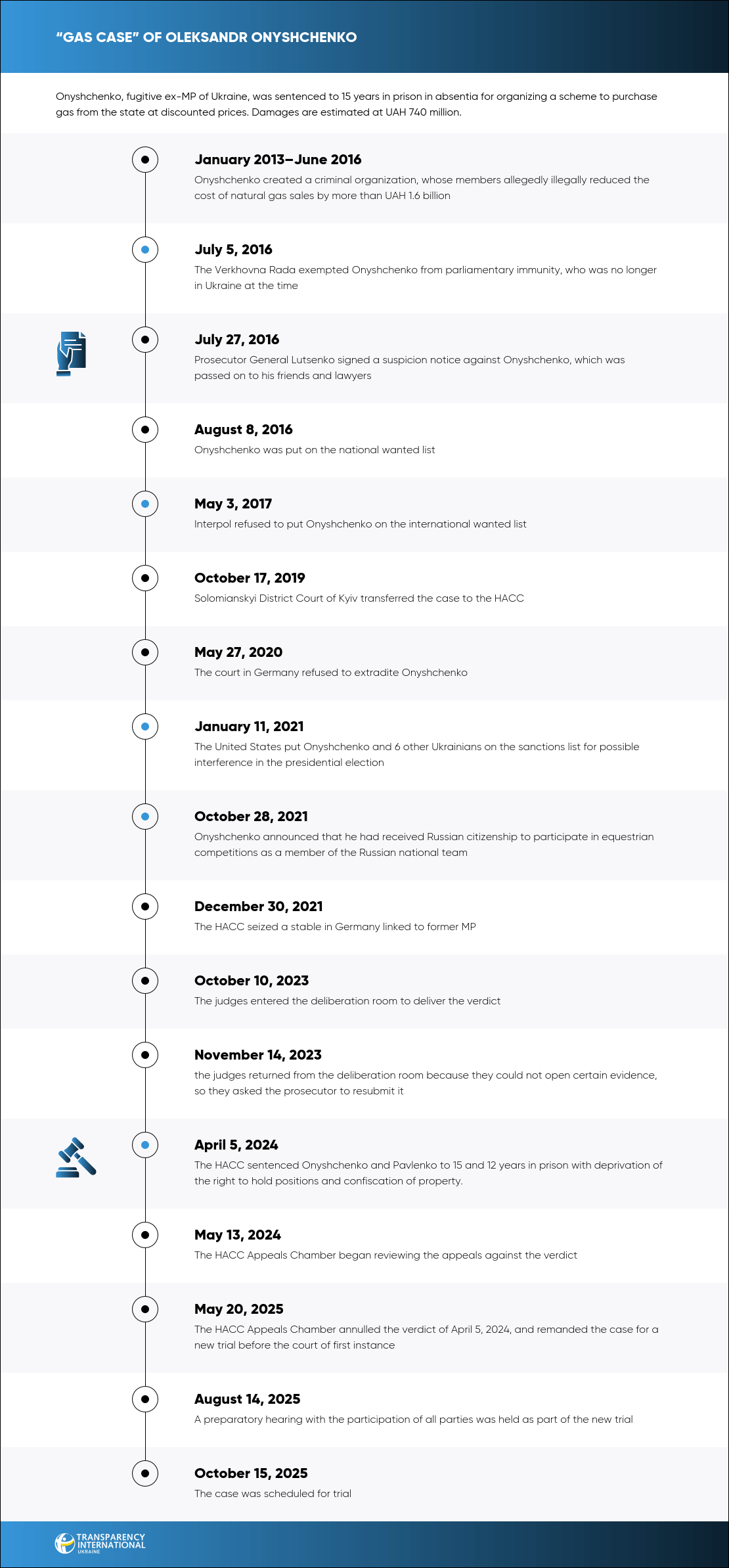 On 5 April 2024, the HACC sentenced former Member of Parliament Oleksandr Onyshchenko to 15 years of imprisonment. The verdict was delivered in absentia, as Onyshchenko has been evading justice abroad. However, on 20 May 2025, the HACC Appeals Chamber annulled the verdict and remanded the case for a new trial before the court of first instance. The former MP is accused of organizing a scheme to misappropriate UAH 740 million through gas procurement at artificially reduced prices.
