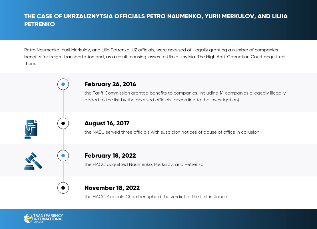 On February 18, 2022, the HACC acquitted 3 Ukrzaliznytsia officials—Petro Naumenko, Yurii Merkulov, and Lilia Petrenko. They were accused of unreasonably granting 14 companies preferential tariffs for cargo transportation.