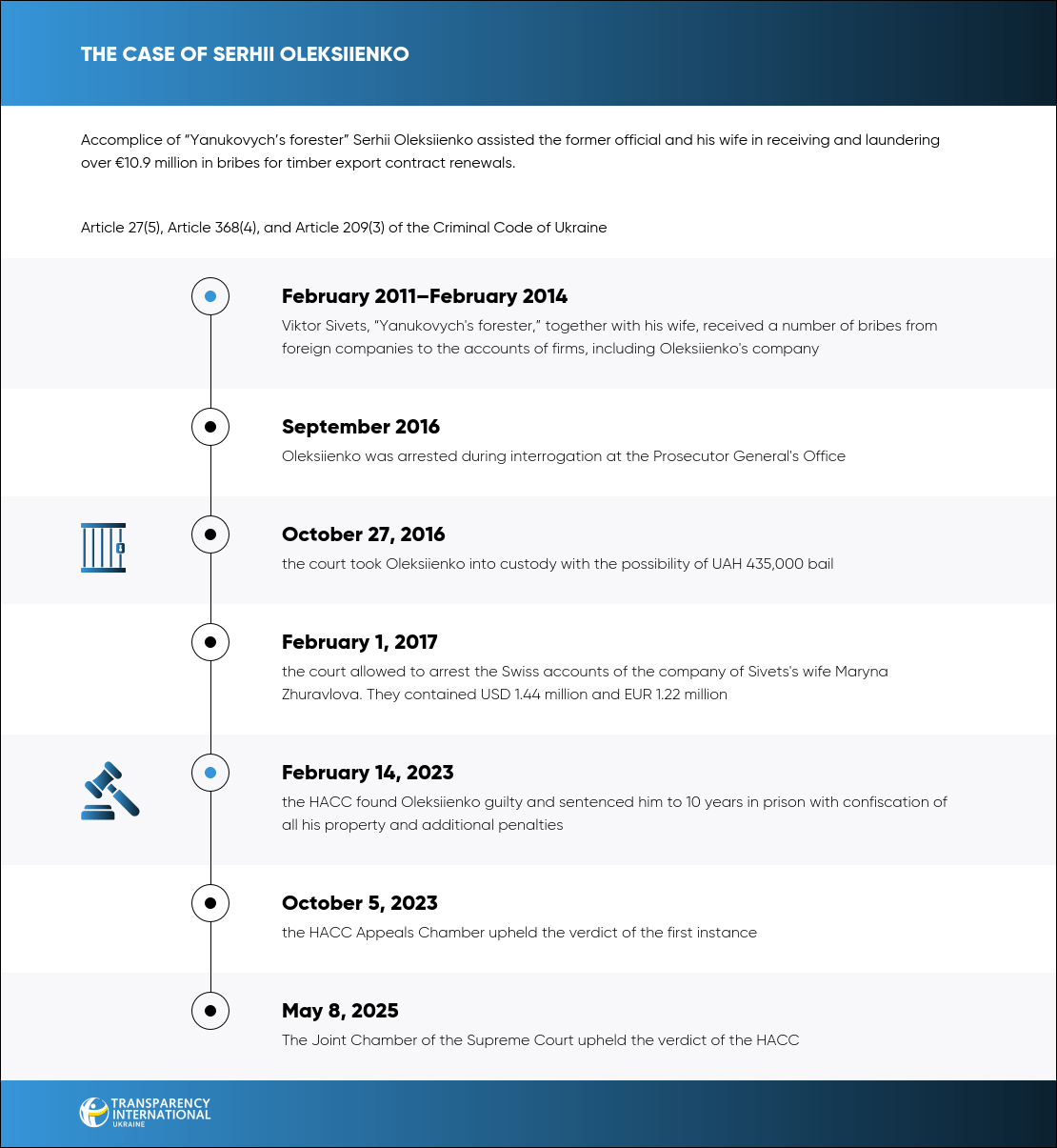On February 14, 2023, the HACC found Serhii Oleksiienko, who was an accomplice of Viktor Sivets, the so-called “Yanukovych's forester,” and his wife, guilty of receiving and further laundering more than EUR 10.9 million in bribes. He was sentenced to 10 years in prison.