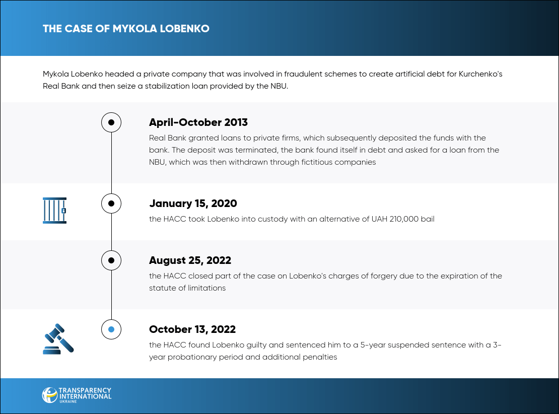 On October 13, 2022, the HACC found Mykola Lobenko, the head of a private firm, guilty of embezzling a UAH 787 million NBU loan and participating in a criminal organization of Yanukovych and Kurchenko.