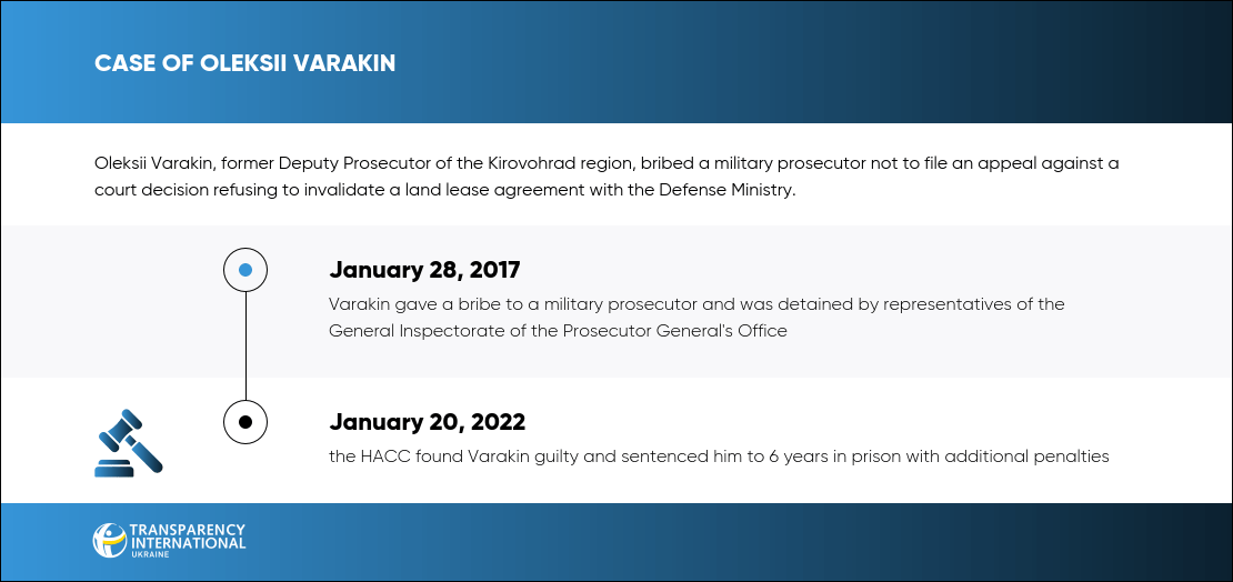 On January 20, 2022, the HACC found Oleksii Varakin, former Deputy Prosecutor of the Kirovohrad region, guilty of offering a bribe to a military prosecutor for not filing an appeal. He was imprisoned for 6 years.