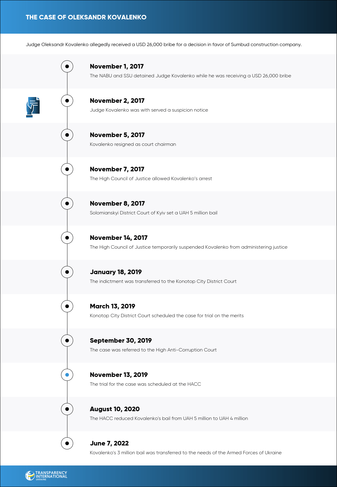 At the end of 2017, Judge Kovalenko resigned from his position as court chair, stating that the organization of the court’s work should not suffer due to the criminal proceedings against him, which he described as pressure and influence from the executive branch.