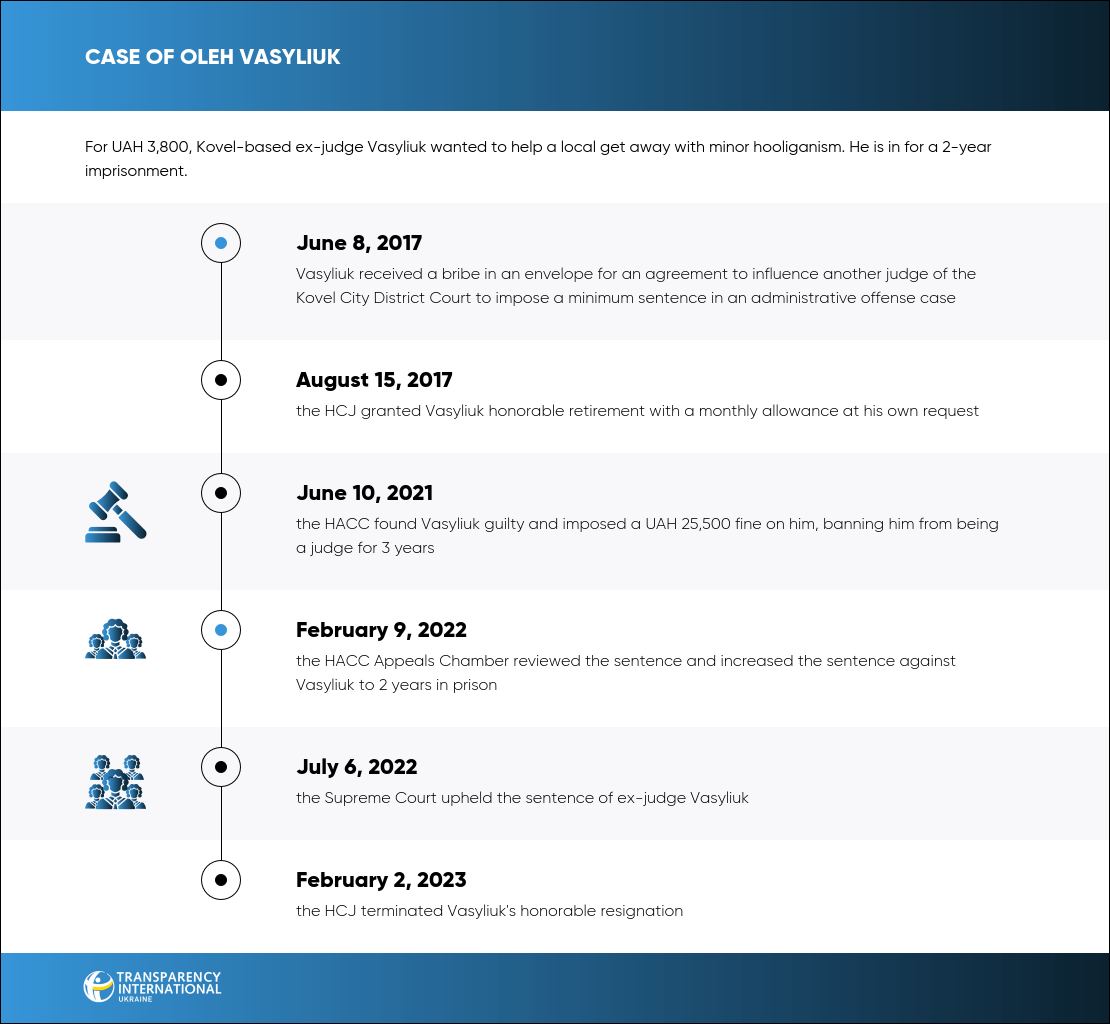 On June 10, 2021, the HACC found Oleh Vasyliuk, former Kovel City District Court judge, guilty of trying to impose a minimum sentence for minor hooliganism on a local for a bribe.