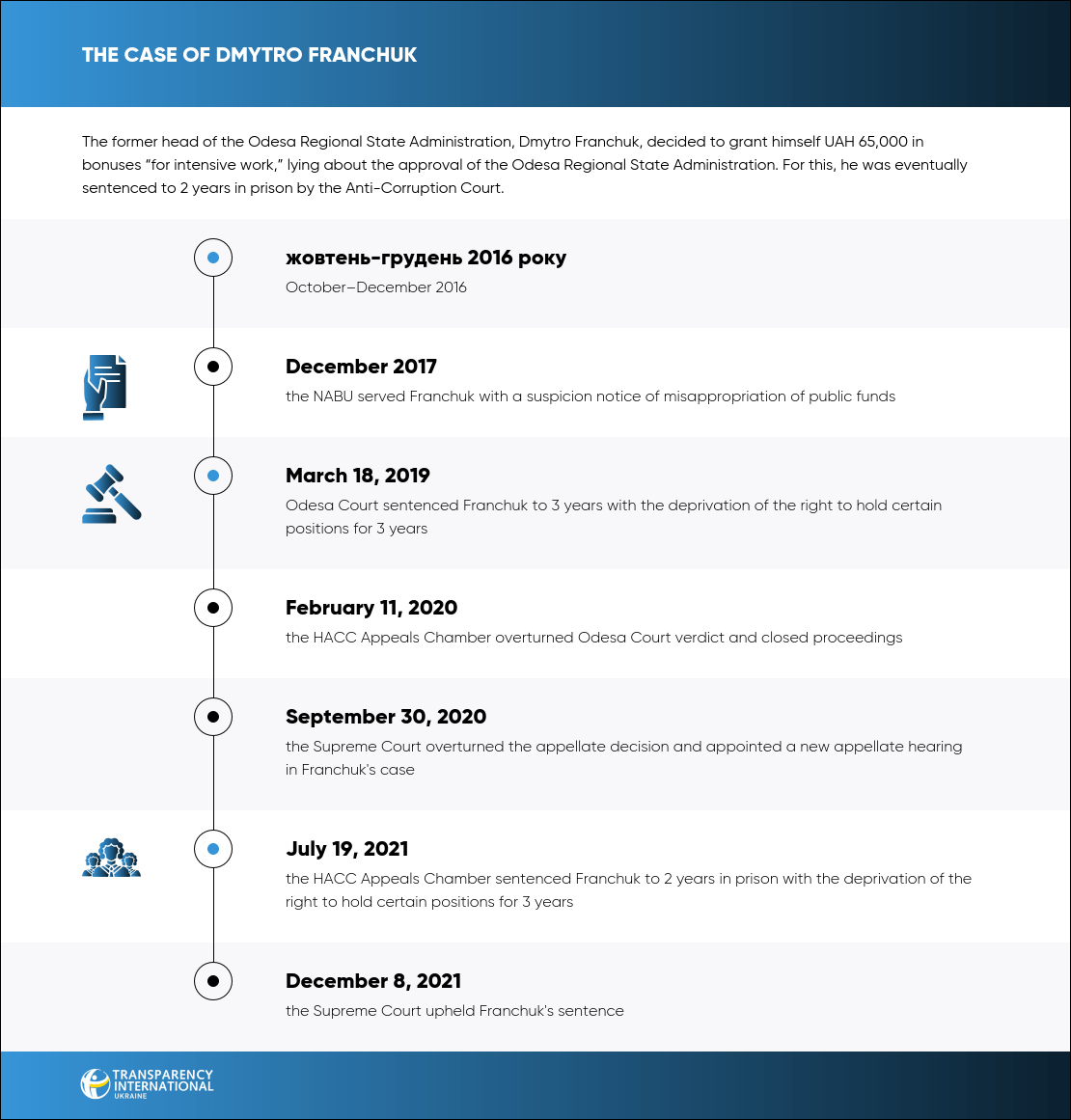 Kyivskyi District Court of Odesa classified Franchuk's actions under Article 191, part 2 of the Criminal Code of Ukraine. He was sentenced to 3 years in prison with a ban on holding certain positions for 3 years. Franchuk was also charged with the same 65,000 of bonuses. The SAPO noted that this was the first conviction with a real prison sentence.