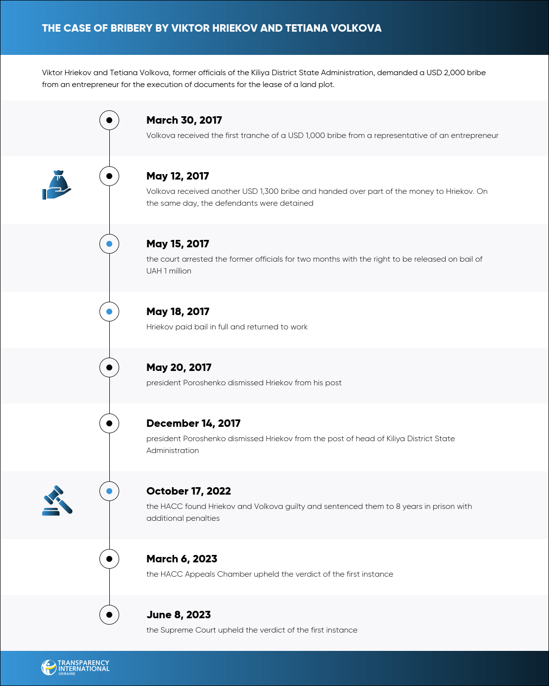 On October 17, 2022, the HACC found Viktor Hriekov and Tetiana Volkova, former officials of the Kiliya District State Administration of the Odesa region, guilty of receiving a USD 2,300 bribe for processing documents for the lease of a land plot.