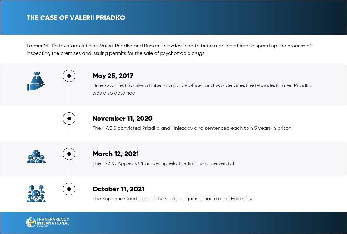 On November 11, 2020, the HACC found Valerii Priadko, former Director of Poltavafarm and former MP of the Poltava Regional Council, and his former Deputy Ruslan Hniezdov guilty of attempting to bribe a police officer. Both were sentenced to 4.5 years.