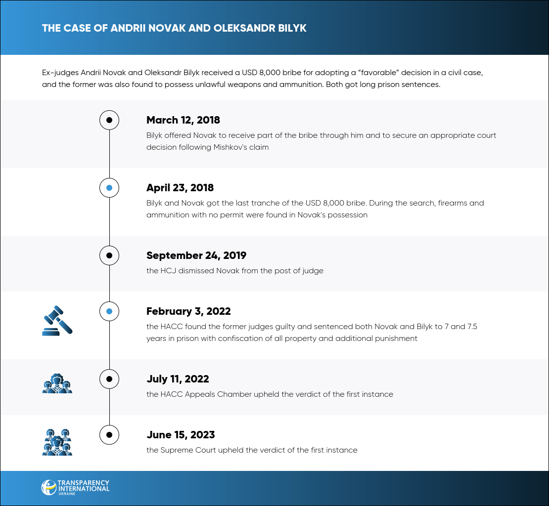 In 2018, Andrii Novak, the then judge of the Holosiivskyi District Court of Kyiv, heard the case under a lawsuit of citizen Mishkov. After the hearing, he found a lawyer, Oleksandr Bilyk, who used to work as a judge in the same court. Bilyk was effectively an intermediary in the subsequent transfer of a part of the bribe that he asked Mishkov for the adoption of a favorable court decision in his lawsuit. Novak and Bilyk received a total of USD 8,000 from Mishkov.