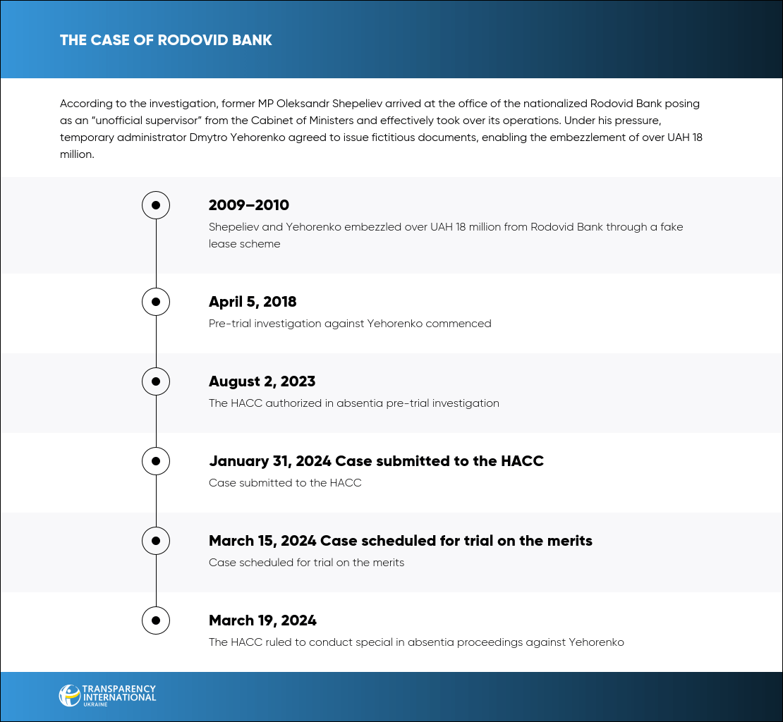 The NABU and the SAPO accuse former Chairman of the Board of Rodovid Bank Dmytro Yehorenko of assisting former MP Oleksandr Shepeliev in misappropriating UAH 18.45 million from the financial institution.