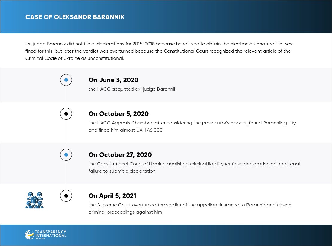Oleksandr Barannik, ex-judge of the Court of Appeal of Dnipropetrovsk Oblast, was accused of failing to submit e-declarations for 2015-2018. The appellate instance imposed a fine on the ex-judge, but later this verdict was overturned due to the scandalous decision of the Constitutional Court of Ukraine to abolish criminal liability for false declaration or intentional failure to submit a declaration.