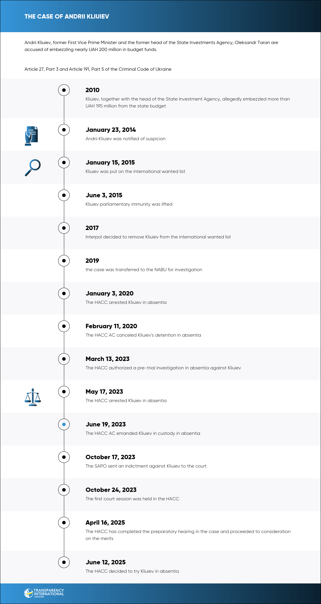 The investigation into these proceedings was initiated by the Department of Special Investigations of the Prosecutor General’s Office in 2014, and the NABU has conducted its own investigation since 2019.