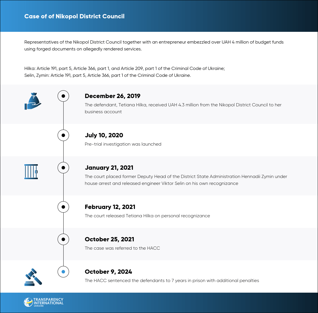 On October 9, 2024, the HACC sentenced several individuals to seven years of imprisonment for the conversion of UAH 4.3 million in public funds belonging to the Nikopol District Council.