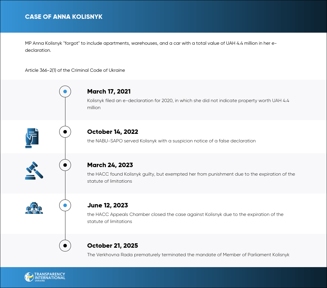 The HACC found MP Anna Kolisnyk guilty of false declaration, for “forgetting” to indicate property worth UAH 4.4 million in her 2020 declaration. The proceedings against her were closed because the statute of limitations had expired.