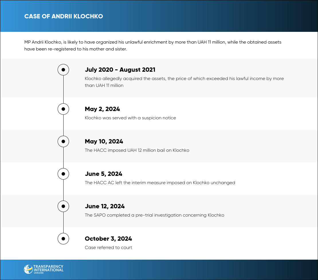 According to the prosecution, Klochko, the MP of the 9th convocation, acquired a lot of property in the 2020–2021, such as Mercedes-Benz S63 and Tesla Model X cars, land plots, apartments, and a residential house. Property rights to part of Klochko’s assets are registered to relatives, namely to his mother and sister, under the power of attorney.