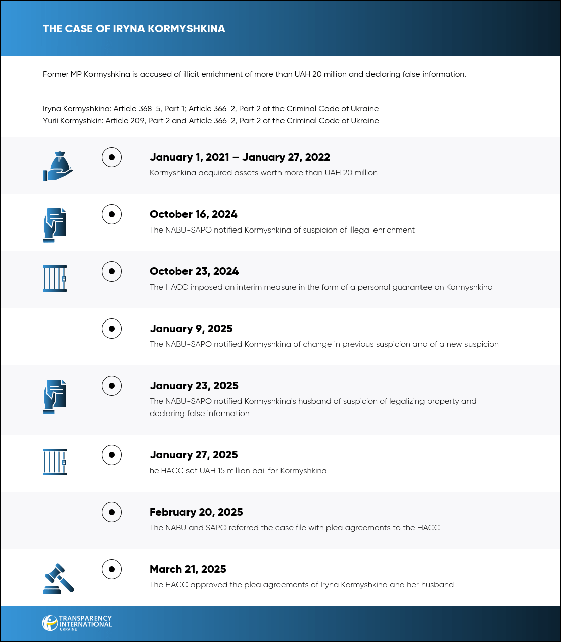 On March 21, 2025, the HACC approved the plea agreement between the SAPO, Iryna Kormyshkina, and her husband. The former MP was found guilty of illegal enrichment and false declaration, while her husband, Yurii Kormyshkin, was found guilty of property legalization and false declaration.