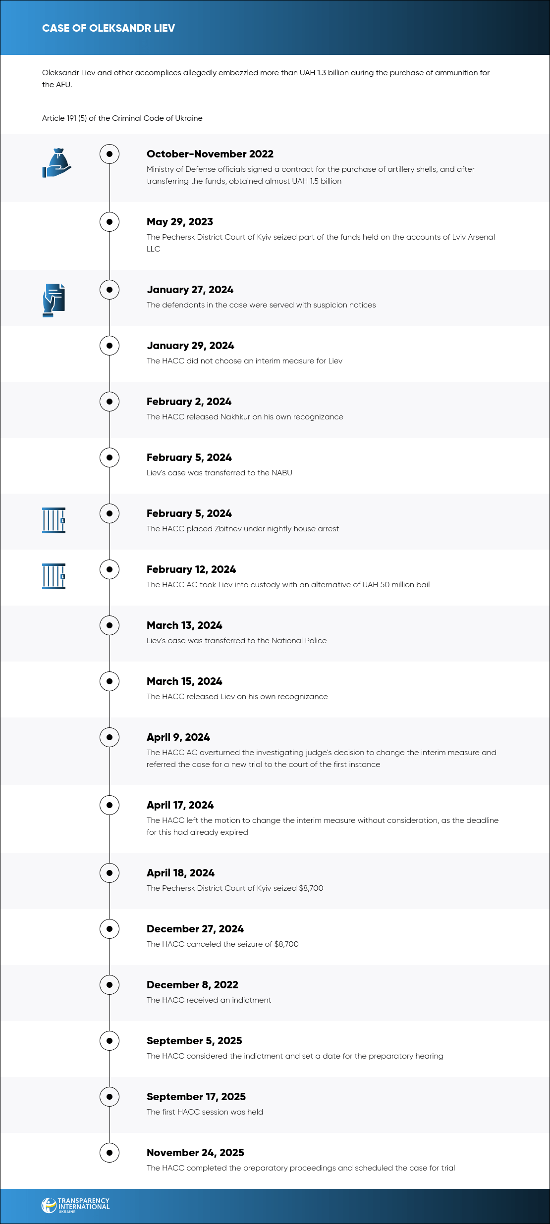 Liiev's role was to enter into an additional agreement to the contract that changed the terms of payment for the ammunition. In breach of the contract, Liiev also prepared and approved a draft decision to make an advance payment of 97% of the contract price, which at the time amounted to more than UAH 1.3 billion. After receiving the funds, Lviv Arsenal transferred the money to the accounts of Khoroshayev's company without supporting documents, from where the funds were transferred to another company.
