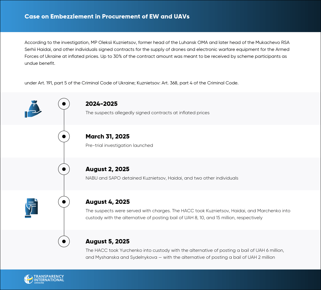 One of the episodes involved the intentional procurement of electronic warfare systems at an inflated price, where group participants received undue benefit in the amount of about 30% of the contract value. Another episode concerned the supply of FPV drones.