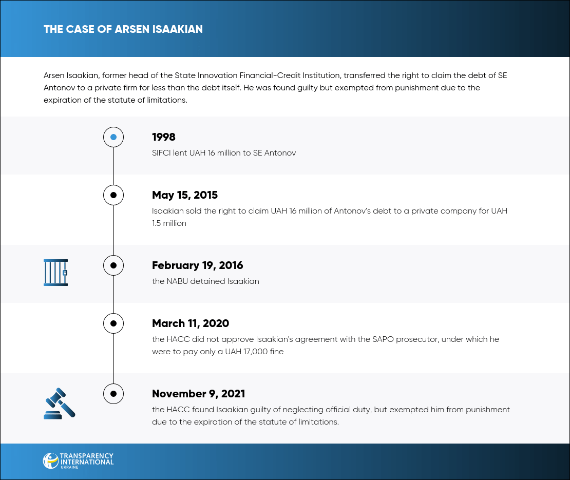 On November 9, the HACC found Arsen Isaakian, former director of the State Innovation Financial-Credit Institution, guilty of transferring the right to claim the debt to a debt recovery firm for a significantly lower amount than the debt itself. The court found him guilty, but exempted him from punishment due to the expiration of the statute of limitations.