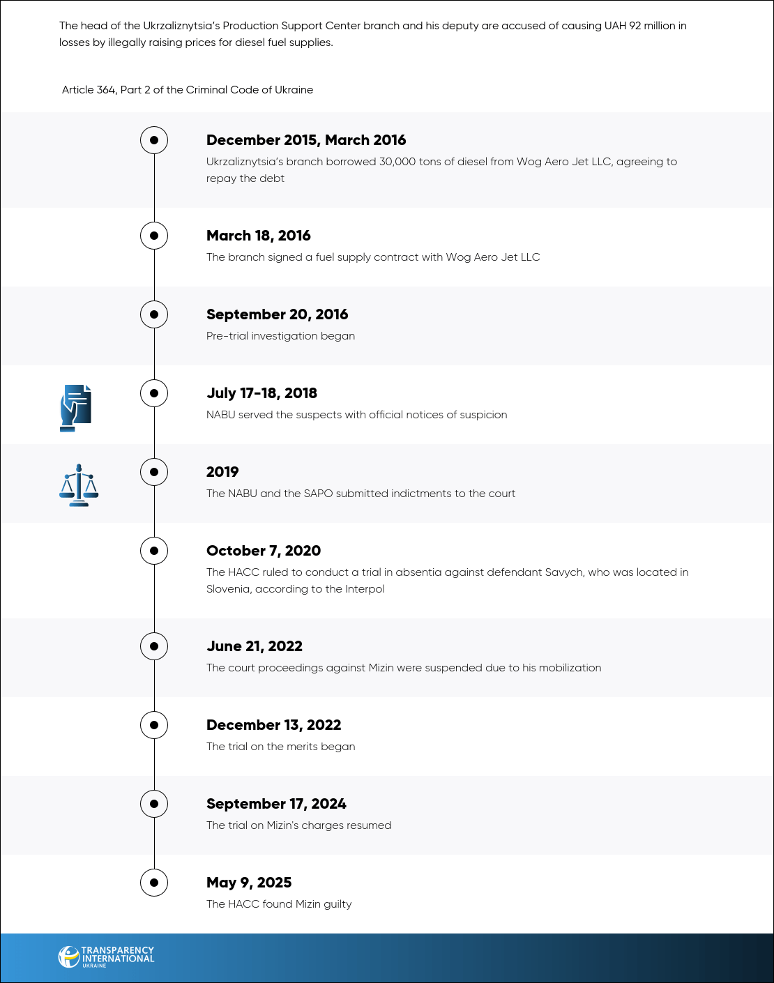 Danyl Mizin, the former head of Ukrzaliznytsia’s Production Support Center branch pleaded guilty. The HACC approved the plea agreement and found him guilty of a criminal offence under Article 364(2) of the Criminal Code of Ukraine. He was sentenced to 5 years of imprisonment with a 3-year ban on holding certain positions and a fine of UAH 17,000. However, under the terms of the agreement, the HACC ruled to release him from serving the main sentence with a 2-year probation period. Mizin was mobilized in 2022 and continues to serve in the Armed Forces.
