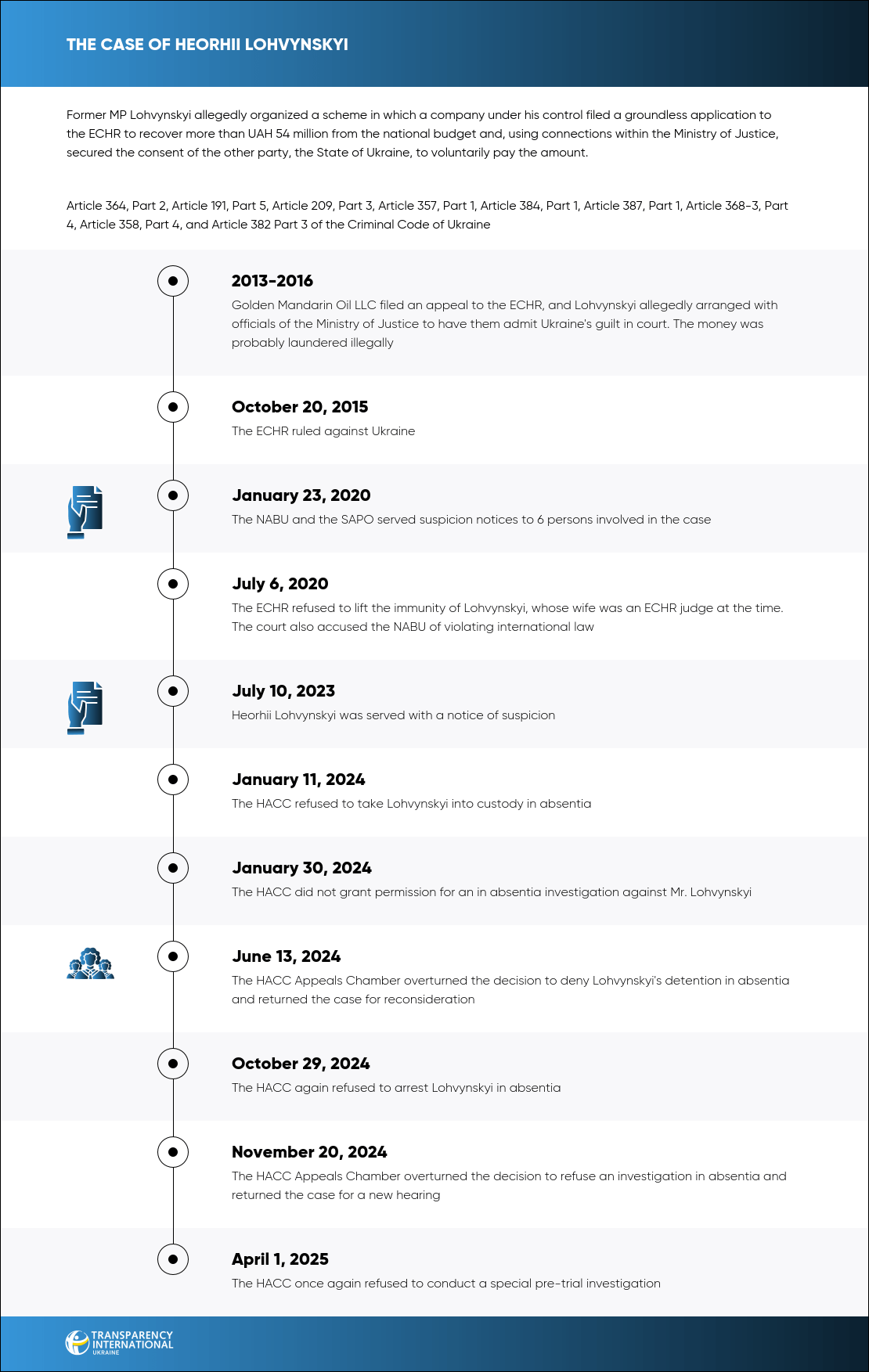 According to law enforcement officers, the ECHR received incomplete information from Golden Mandarin Oil LLC, and people controlled by Lohvynskyi in the offices of the Ministry of Justice ensured that Ukraine lost in court. On October 20, 2015, the ECHR ruled against Ukraine, ordering it to comply with the 2009 court order.
