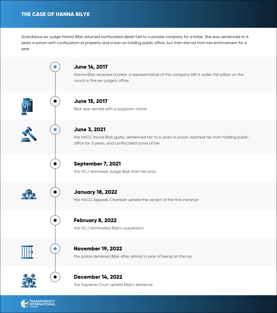 On June 3, 2021, the HACC sentenced scandalous judge Hanna Bilyk to 6 years in prison. She “sold” the decision to return the confiscated fuel for USD 1,000.