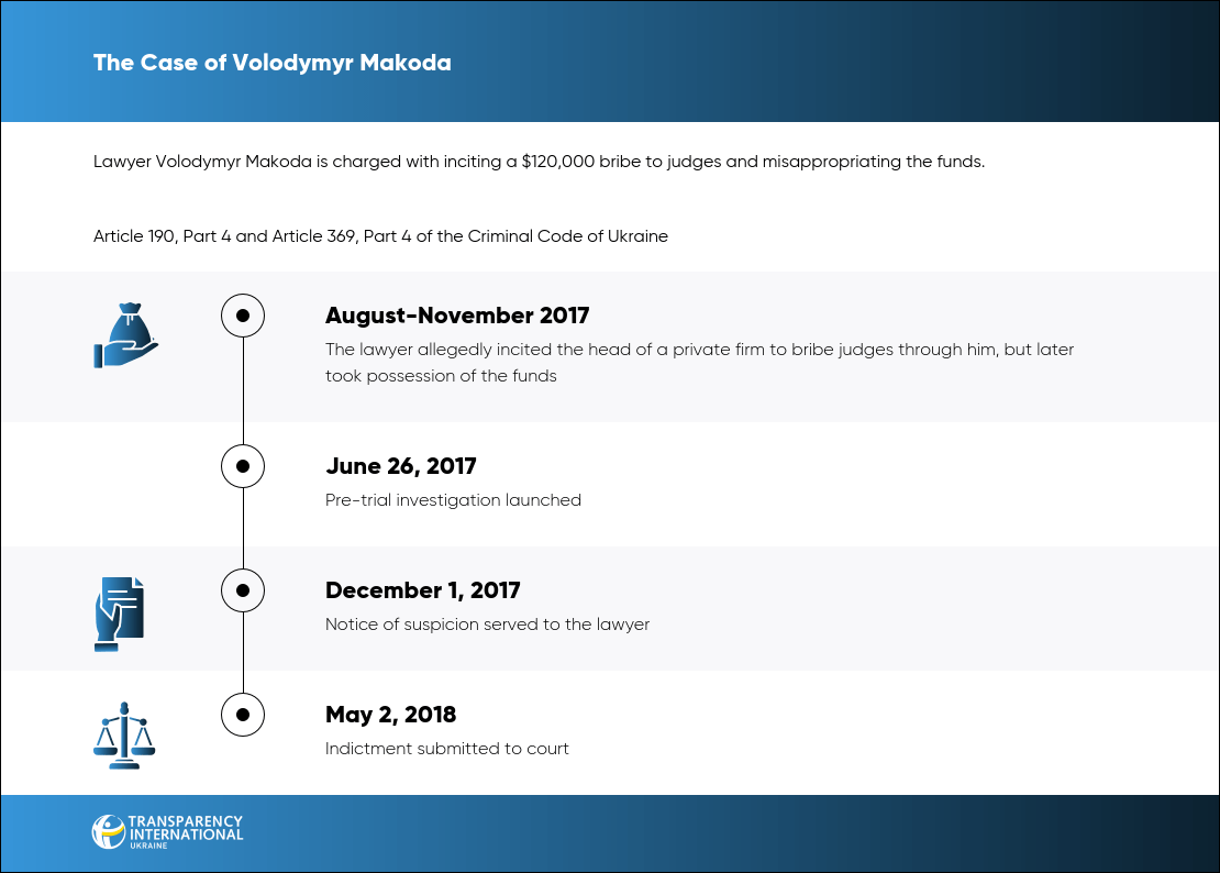 According to the case materials, between August and November 2017, lawyer Volodymyr Makoda, leveraging his close ties with a judge of the High Specialized Court of Ukraine for Civil and Criminal Cases (HSCU), persuaded Yuliia Hrynda, director of Hostynets LLC, to provide a $120,000 bribe. The money was allegedly intended for HSCU judges to secure a favorable decision in the company's favor.