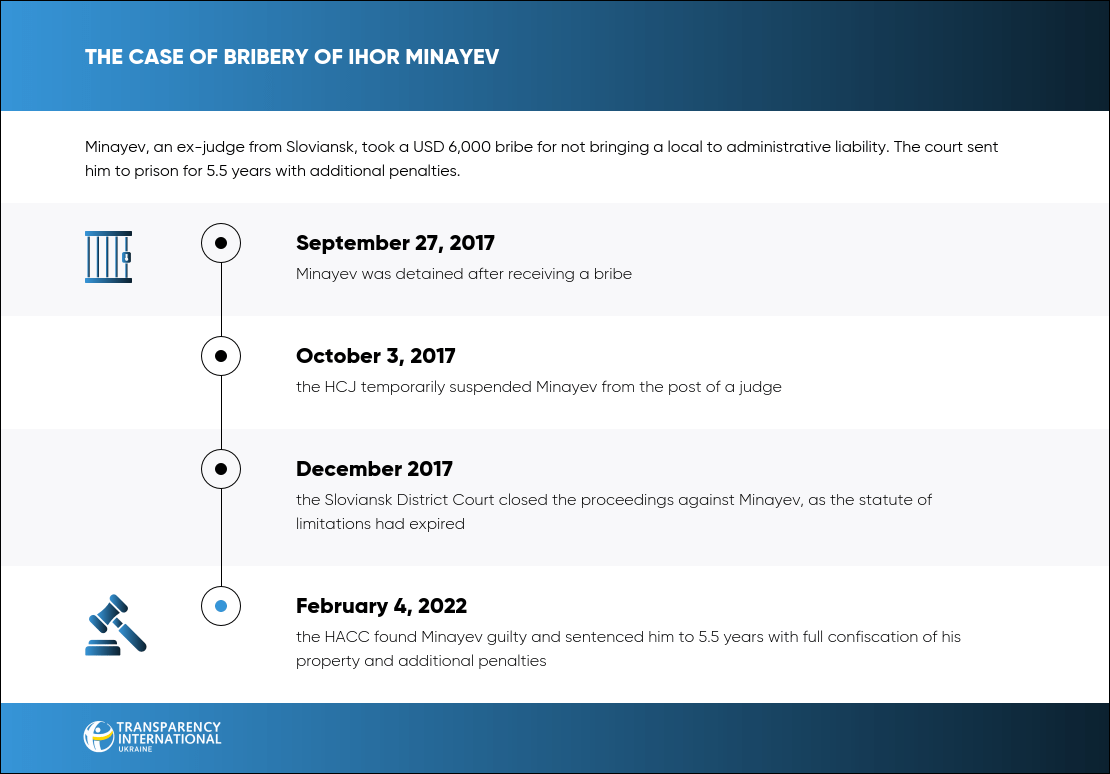 On February 4, 2022, the HACC found Ihor Minayev, a Sloviansk judge, guilty of taking a bribe for not bringing a local to administrative liability. Minayev was sentenced to 5.5 years in prison.