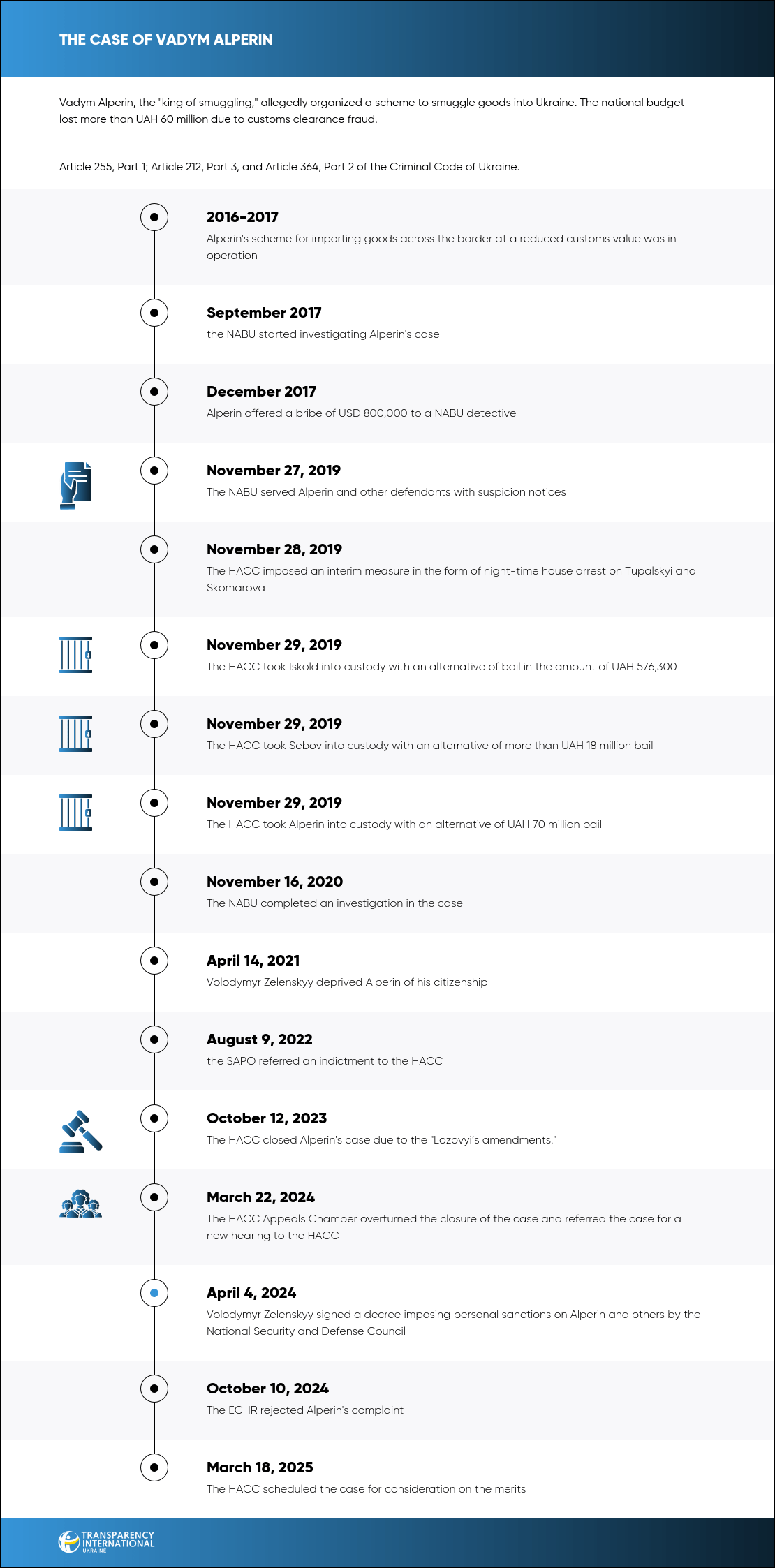 According to the prosecution, in mid-2016, Alperin established a criminal organization with structural units in Odesa and Kyiv. The group was joined by Alina Skomarova, former Director of the SFS Department; Serhii Tupalskyi, Deputy Chairman of Kyiv Customs; Alperin's colleagues Oleh Sebov and Yevhenii Iskold; and Serhii Shkuratov, a representative of private companies at the customs.