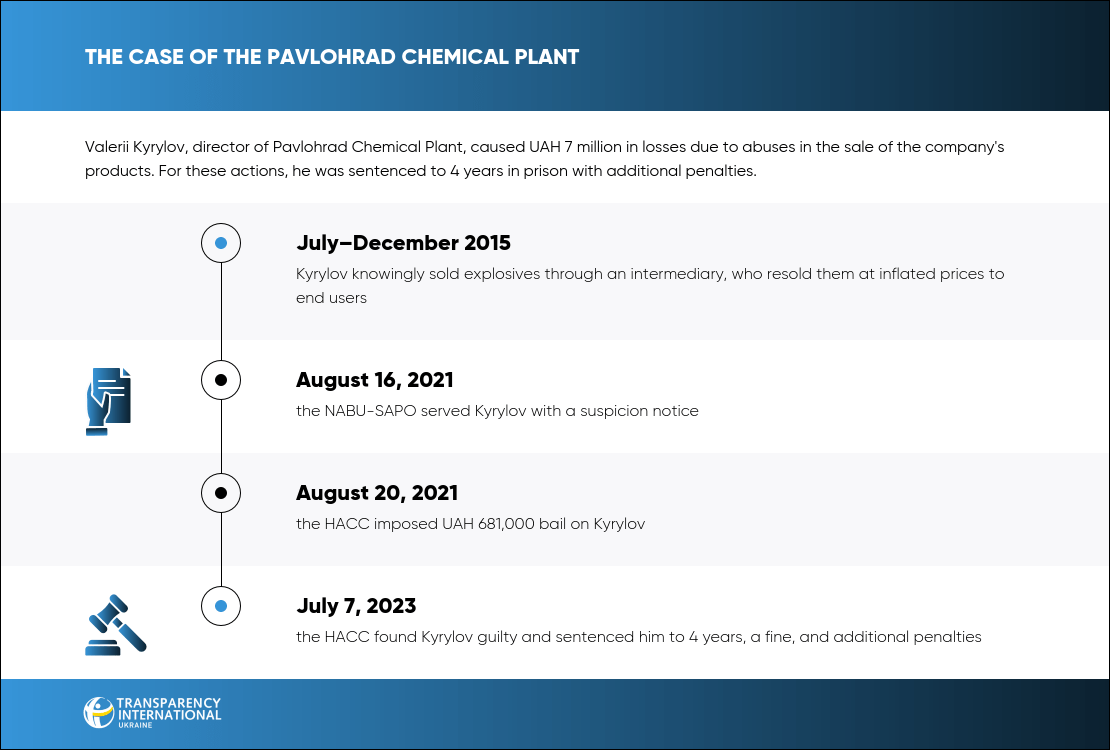 On July 7, 2023, the HACCU convicted Valerii Kyrylov, commercial director of the Pavlohrad Chemical Plant, of abusing the sale of explosives through intermediaries. He was sentenced to 4 years.