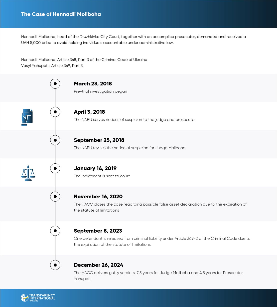 Hennadii Moliboha’s actions were classified under Article 368, Part 3 of the Criminal Code of Ukraine, while Vasyl Yahupets’ actions fell under Article 369, Part 3. They were sentenced to 7.5 years and 4.5 years in prison, respectively. The court also ordered the confiscation of Moliboha's property and imposed a two-year ban on him holding public office.