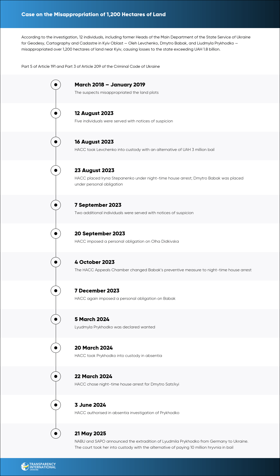 According to the investigation, the land was misappropriated by an organised criminal group that included former Heads of the Main Department of the State Service of Ukraine for Geodesy, Cartography and Cadastre in Kyiv Oblast — Oleh Levchenko, Dmytro Babak, Liudmyla Prykhodko, and Iryna Stepanenko — as well as the former Deputy Head of the Main Department of the State Service of Ukraine for Geodesy, Cartography and Cadastre in Kyiv Oblast, Olha Didkivska, the former Head of a Department at the State Enterprise Research and Design Institute of Land Management, Dmytro Satskyi, and others.