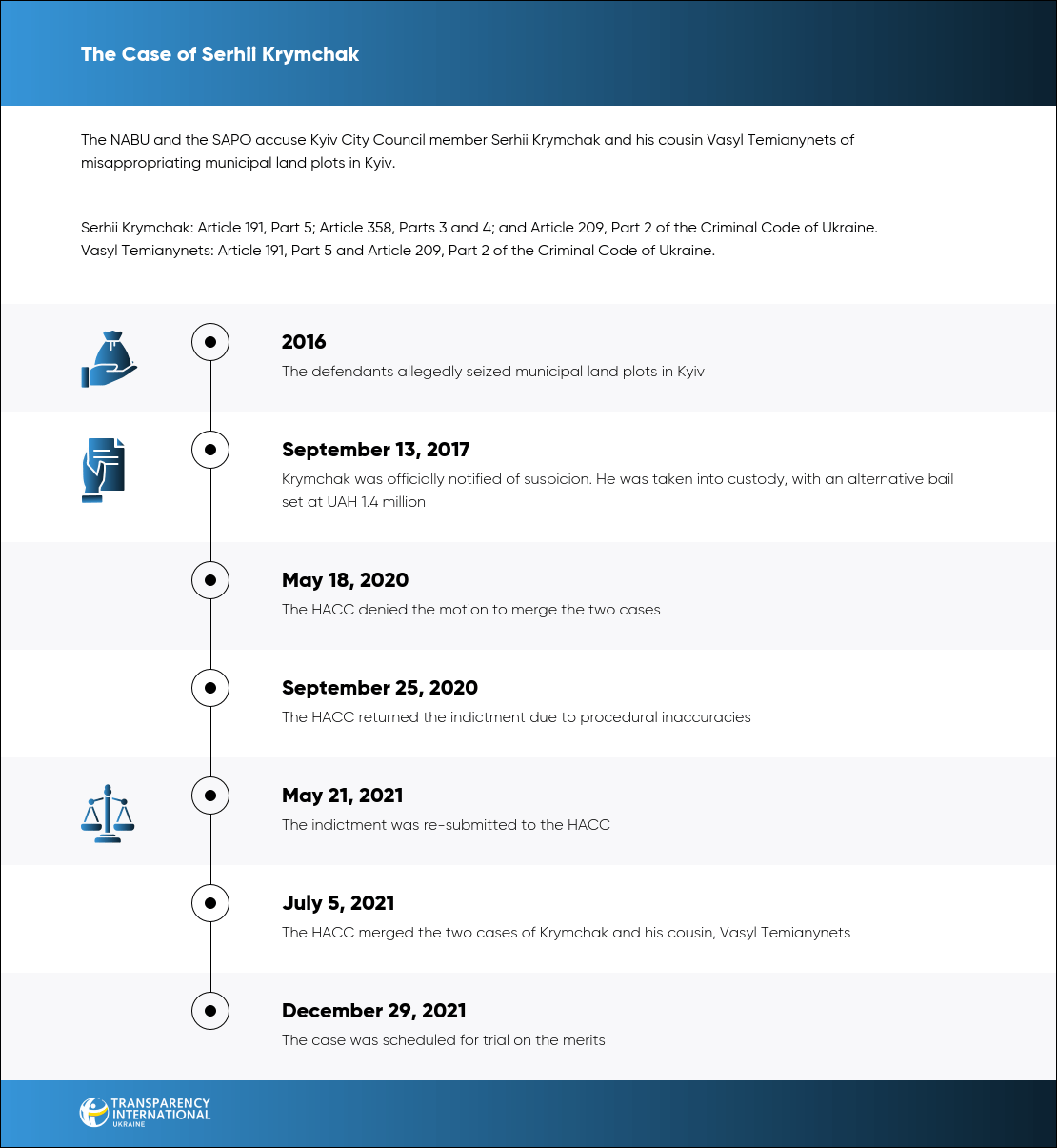 According to the prosecution, then-member of the council and Secretary of the Kyiv City Council's Land Relations Commission, Serhii Krymchak, took advantage of his access to information about municipal land plots in the capital to organize a scheme to acquire six land plots in the Holosiivskyi District of Kyiv, with a total value of over UAH 2.5 million. To carry out the scheme, he enlisted the help of his cousin, Vasyl Temianynets, who acted as an accomplice by identifying individuals to formally register ownership of municipal land plots.