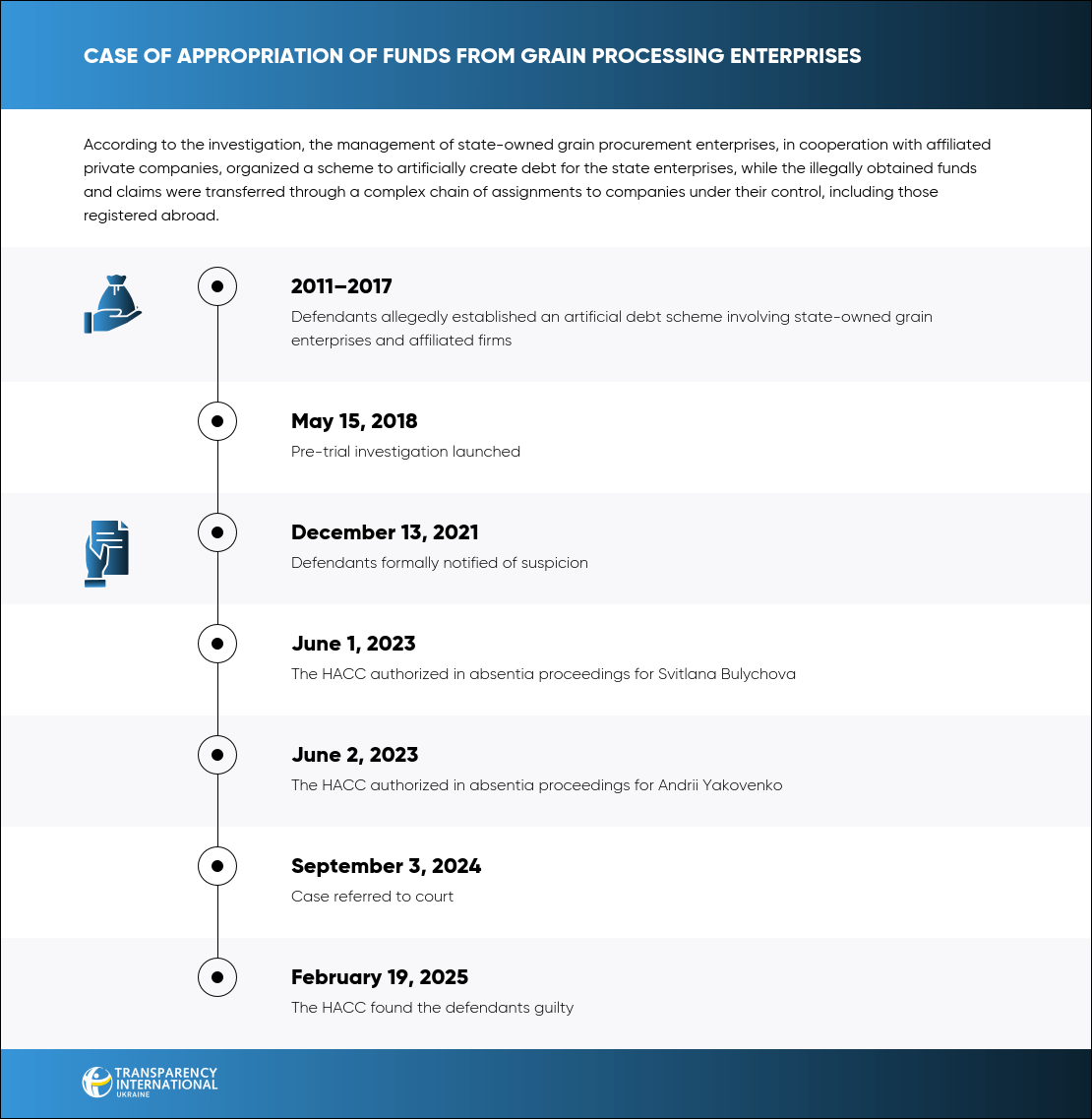 The defendants were charged under Article 191(5) of the Criminal Code of Ukraine. The HACC approved a plea agreement and found them guilty. The verdict is not yet available in the official registry. Andrii Yakovenko was sentenced to 7 years of imprisonment with a 3-year probationary period. Yevhen Svystunov — 7 years of suspended sentence with a 2.5-year probation. Dmytro Hostrenko, Svitlana Bulychkova, Oleh Mohylnyi, and Serhii Korostyliov — 4 years of imprisonment with a 2.5-year probation.