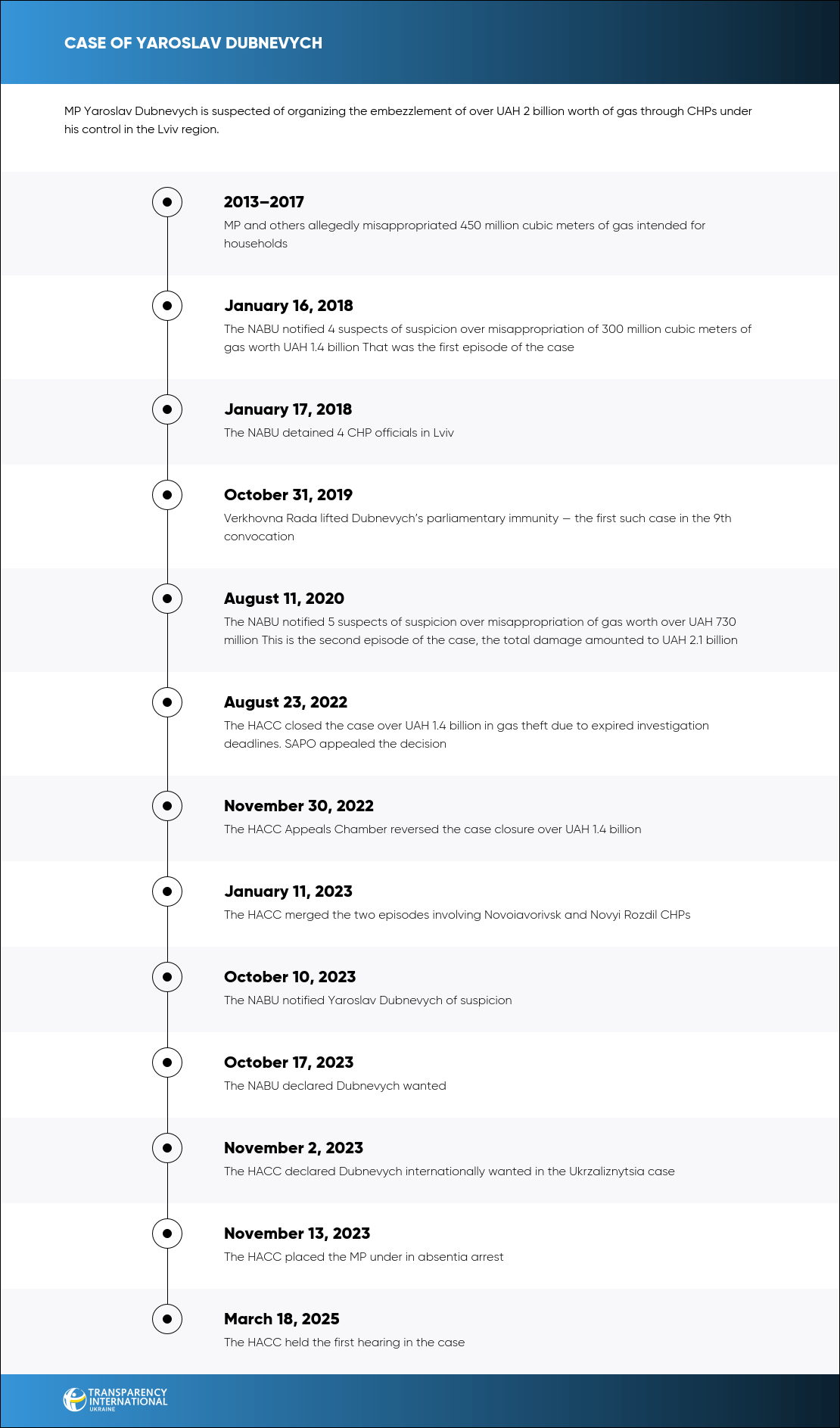 Yaroslav Dubnevych is accused of orchestrating the embezzlement of natural gas from NAK Naftogaz of Ukraine, resulting in losses to the state (represented by Naftogaz) amounting to over UAH 2.1 billion, and of laundering over UAH 457 million.