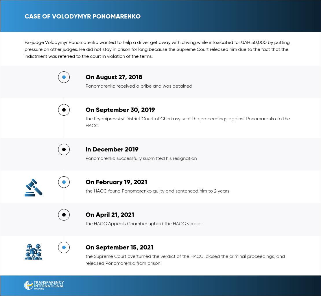 On February 19, 2021, the HACC found judge Volodymyr Ponomarenko from Cherkasy guilty of taking a bribe of UAH 30,000 for influencing the decision of other judges to help a driver get away with driving while intoxicated.
