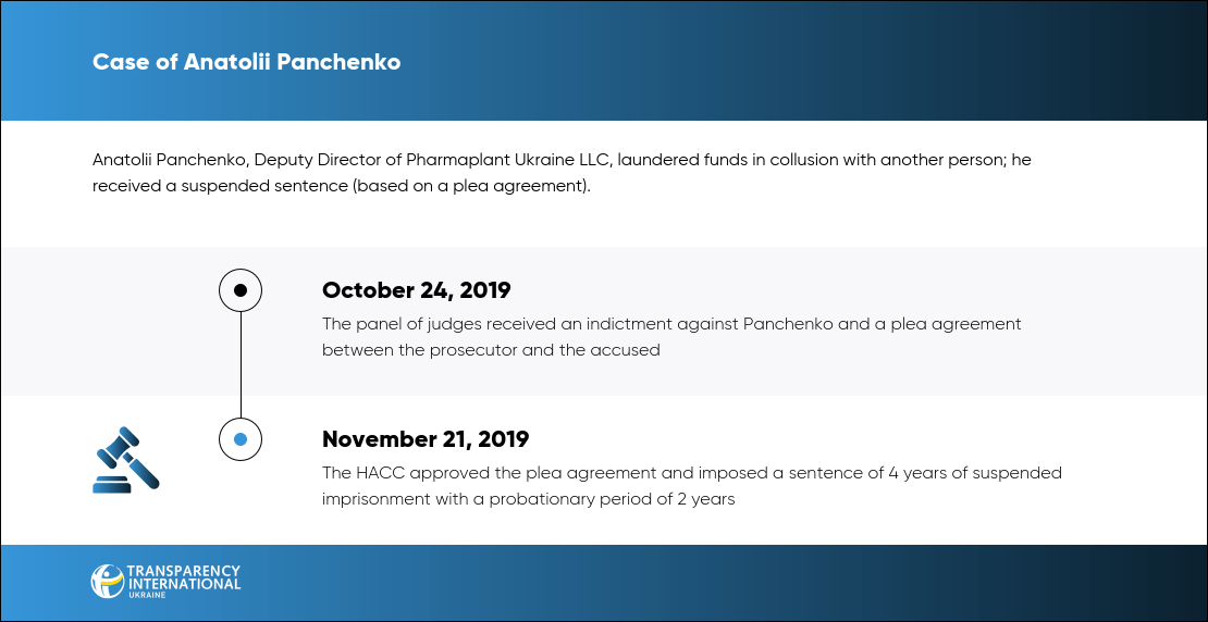 On November 21, 2019, the HACC found Anatolii Panchenko, Deputy Director of Pharmaplant Ukraine LLC, guilty of money laundering derived from crime. The court approved the plea agreement, so Panchenko was sentenced to 4 years in prison with a probationary period of 2 years.