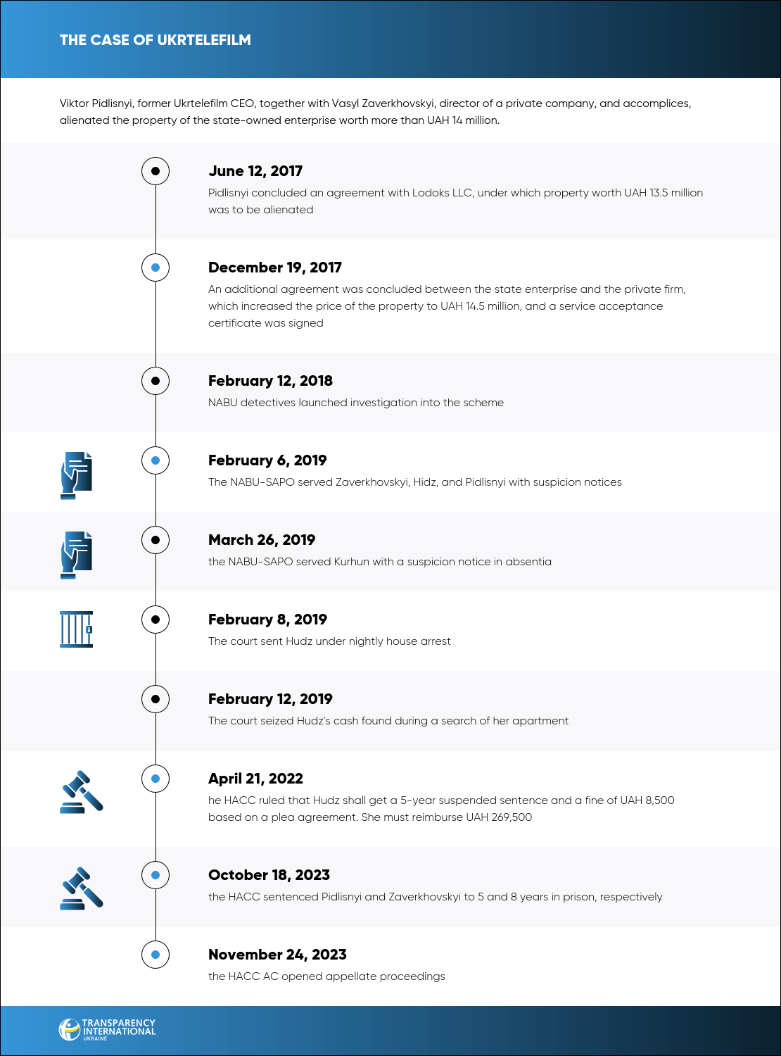 On October 18, 2023, the HACC found former Ukrtelefilm CEO Viktor Pidlisnyi guilty in the case of alienation of the state-owned enterprise's property and having caused almost UAH 70 million in damages. He was sentenced to 5 years in prison and a fine.