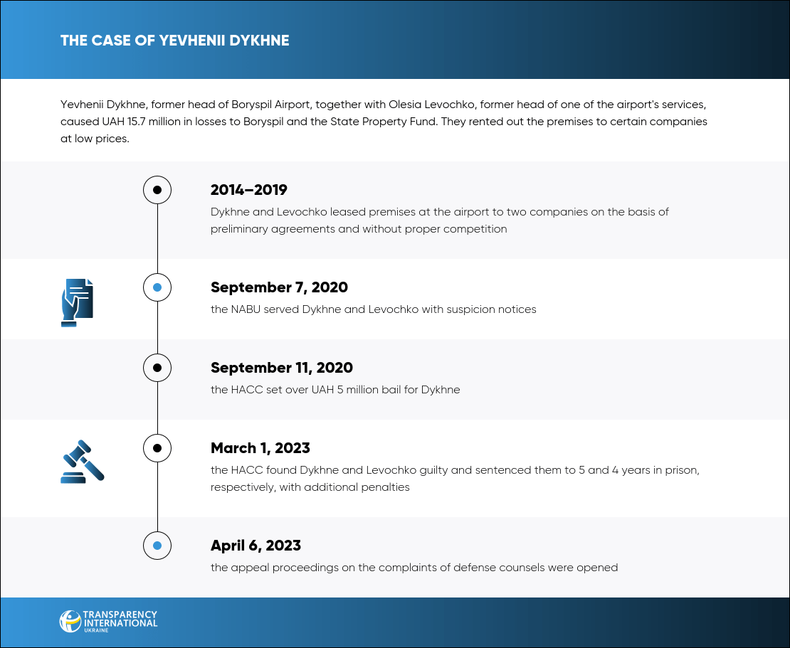 On March 1, 2023, the HACC found Yevhenii Dykhne, the former head of Boryspil Airport, and Olesia Levochko, the head of one of the airport's services, guilty of leasing the airport's premises at low prices. The former officials were sentenced to 5 and 4 years in prison, respectively.