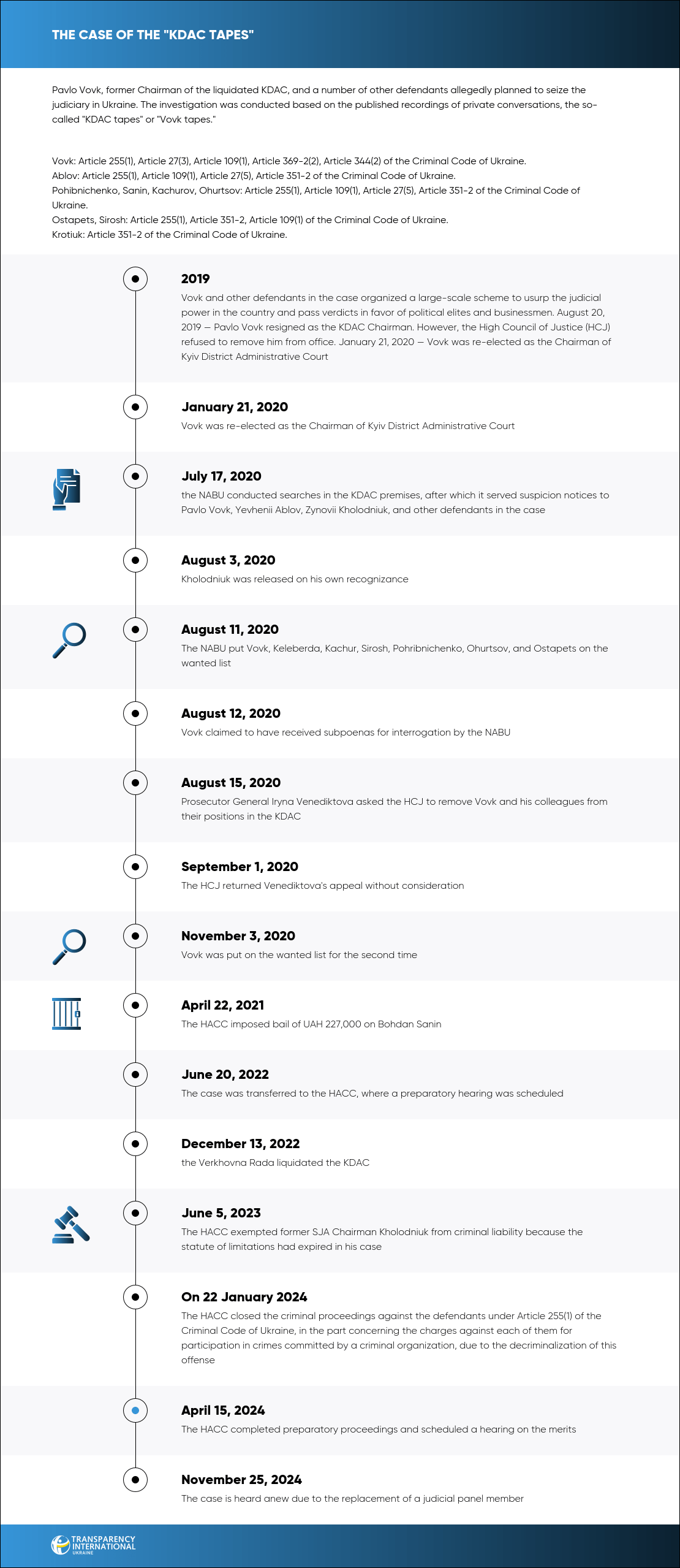 The NABU and the SAPO accused Pavlo Vovk, former Chairman of the liquidated Kyiv District Administrative Court (KDAC), and a number of other defendants of establishing a criminal organization for the alleged seizure of the judicial power. The investigation was conducted based on the published recordings of private conversations, the so-called "KDAC tapes" or "Vovk tapes."