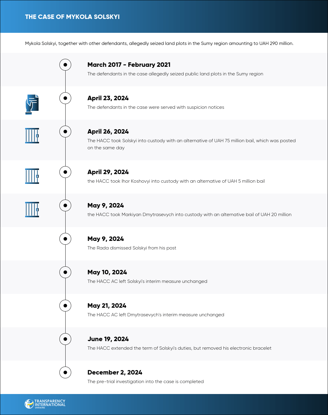 Another accomplice, Ihor Koshevyi, who was involved in the selection of participants in the scheme, effectively received a salary from Solskyi. Also involved in the case were Oleksandr Kolotilin, former head of the State Geocadastre; Solskyi's trustee Mykola Antoniuk, and Mykhailo Buhrymenko, director of a private firm. The actions of the defendants were classified under Article 191, clause 5 of the Criminal Code of Ukraine.