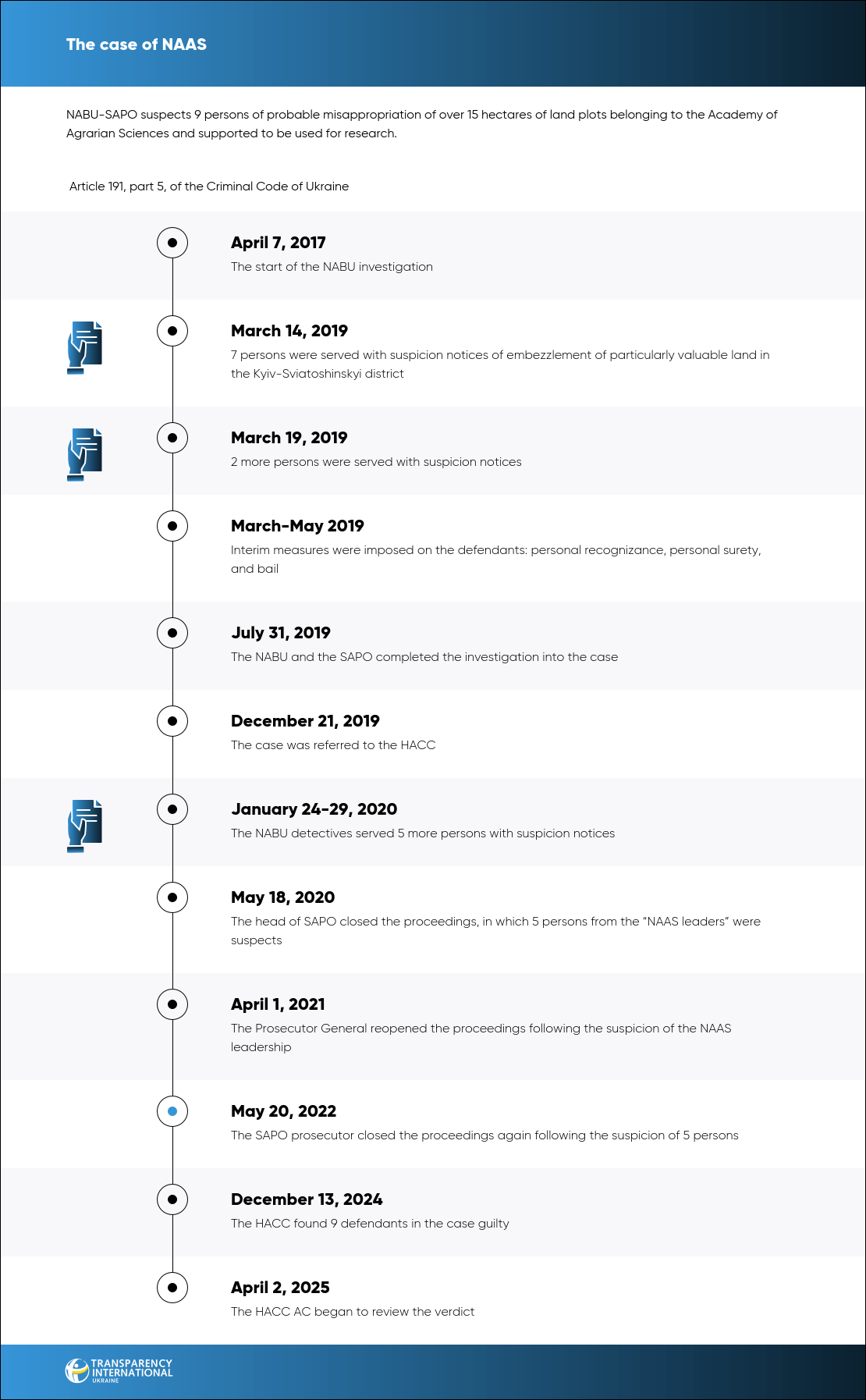The suspects’ actions are classified under Article 191(5) of the Criminal Code of Ukraine. In January 2020, 5 senior officials of the Academy were served with suspicion notices. However, in May 2020, the head of the SAPO closed proceedings against the “NAAS leaders” because of a lack of evidence to provide the mercenary motives of the defendants during the voting. More information can be found in our material on the NAAS case.