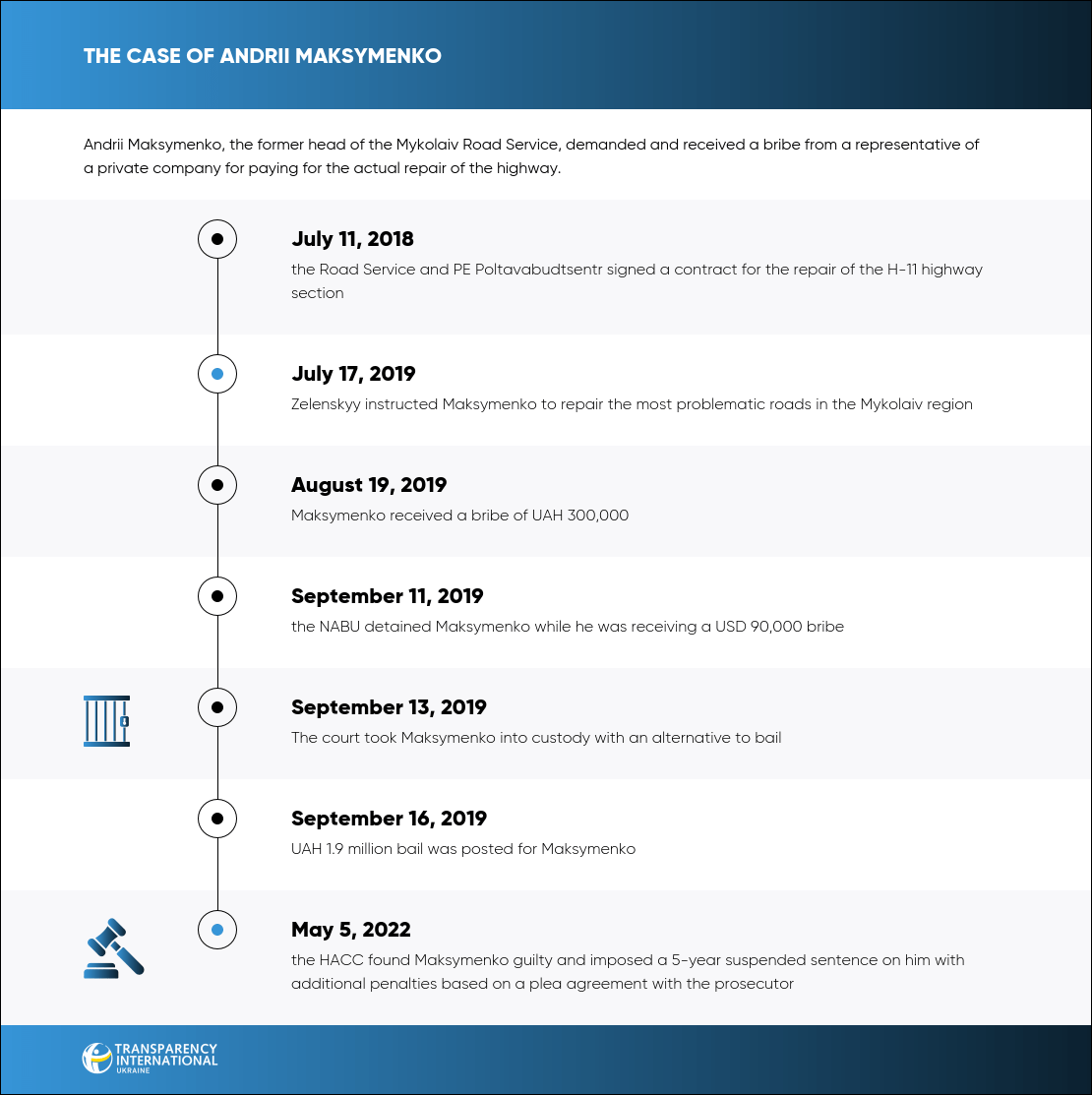 On May 5, 2022, the High Anti-Corruption Court found Andrii Maksymenko, head of the Mykolaiv Road Service, guilty of receiving USD 90,000 and UAH 300,000 in bribes for the road's compliance with the terms of a contract with a private company to repair the H-11 Dnipro-Mykolaiv highway. He got a 5-year suspended sentence.