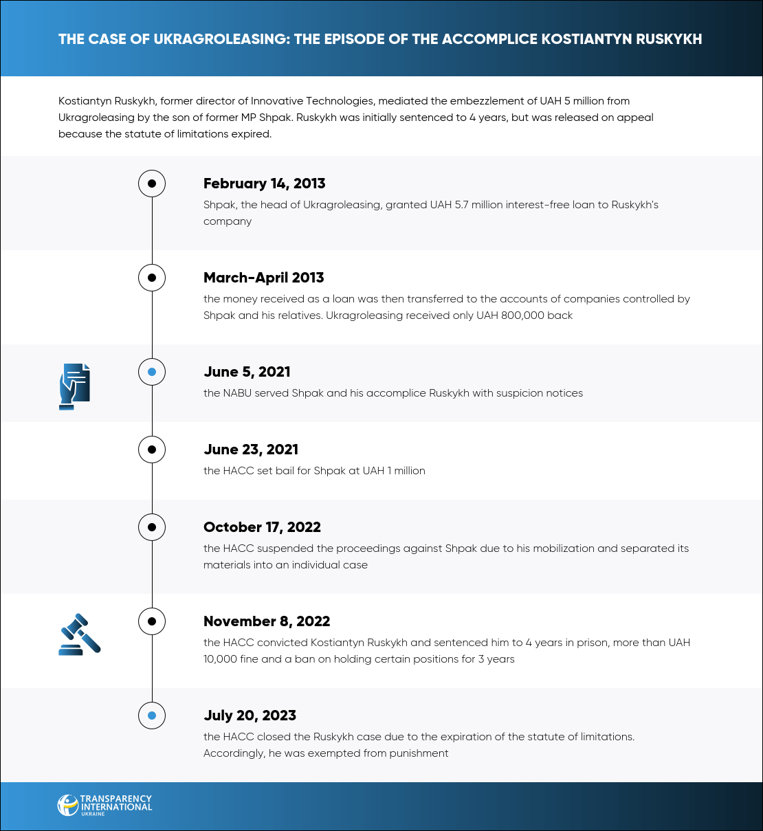 On November 8, 2022, the HACC found Kostiantyn Ruskykh, former head of Innovative Technologies, guilty of being an accomplice to the son of former MP Shpak in the embezzlement of Ukragroleasing property. Ruskykh was sentenced to 4 years in prison.